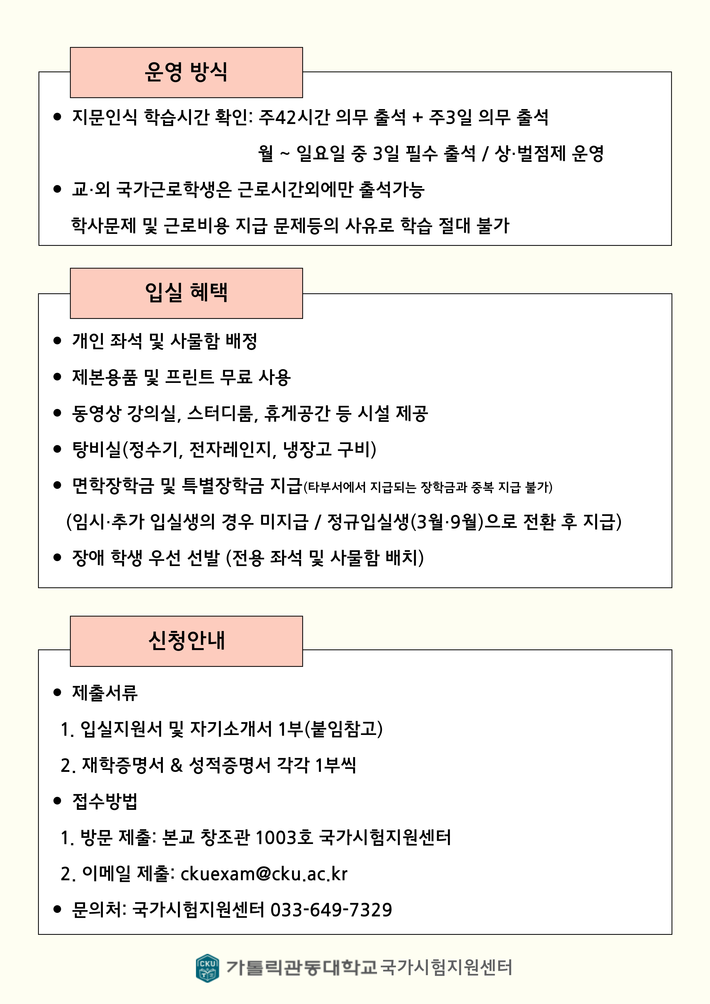 fnctId=bbs,fnctNo=1202 글번호 361479 2025학년도 국가시험지원센터 제6차 동계방학 임시입실생 모집 공고 분류 CKU공지 수정일 2026.03.17 작성자 국가시험지원센터 조회수 533 등록일 2025.12.01 첨부파일 붙임1 가톨릭관동대학교 국가시험지원센터 입실 지원서 및 자기소개서 양식.hwp 바로보기 이전글 [강원대학교] 『공공기관 취업 캠프: 산림인재, 꿈을 펼치다』 모집 안내 취업지원팀 2025-11-28 15:23:49.0 다음글 [군산문화관광재단] 2026 직원 채용 공고(~12.10) 취업지원팀 2025-12-01 10:16:26.0 분류 전체 CKU공지 비교과 현장실습 취업 장학 입학 행사 입찰 채용 국제교류 보건복지 게시물 검색 제목 작성자 RSS 2.0 15241건, 현재페이지: 1/1525 게시글 리스트 CKU소식 > CKU공지 목록 - 번호,제목,작성자,작성일,조회수,첨부파일 번호 제목 처리상태 작성자 작성일 조회수 첨부파일 일반공지 서울경부(강남터미널) ↔ 가톨릭관동대학교 운행 고속버스 이용 안내 처리상태 학생장학복지팀 2026.03.07 568 0 일반공지 2026학년도 1학기 "천원의 아침밥" 운영 안내 처리상태 학생장학복지팀 2026.03.03 1525 1 일반공지 가톨릭관동대학교 2026학년도 안전관리계획 처리상태 최진영 2026.02.27 2277 1 일반공지 2026학년도 대학생청소년교육지원사업 근로장학생 모집 처리상태 학생장학복지팀 2026.02.22 7568 2 일반공지 2026학년도 1학기 강릉 시내 통학버스 운영 안내 처리상태 학생장학복지팀 2026.02.08 6383 1 일반공지 취업자격증! 취업준비! "온라인 취업준비 Mall" 신규 오픈! 처리상태 김연순 2025.10.10 1471 1 일반공지 2025학년도 재학생 단체상해보험 치료비 청구 안내 처리상태 학생장학복지팀 2025.05.05 2810 2 15241 [강원특별자치도경찰청] 2026년 제1회 일반직공무원 경력경쟁채용시험 안내 새글 대기 취업지원팀 2026.03.17 22 2 15240 [교동씨엠] 채용공고 새글 대기 취업지원팀 2026.03.17 27 1 15239 [KT&G] 2026년 상반기 KT&G 신입/경력사원 채용(~4/6(월) 15시까지) 새글 대기 취업지원팀 2026.03.17 30 0 15238 [서한그룹] 2026 서한그룹 공개채용 (~3/30) 새글 대기 취업지원팀 2026.03.17 34 0 15237 [재단법인 서울장학재단] 2026년 상반기 서울인재대학장학생 선발 안내 새글 대기 학생장학복지팀 2026.03.17 39 1 15236 [익산시] 2026년 상반기 익산시 대학생 학자금 대출이자 지원 사업 안내 새글 대기 학생장학복지팀 2026.03.17 30 2 15235 [강원인재원] 2026년도 주거비 장학생 선발 안내 새글 대기 학생장학복지팀 2026.03.17 58 1 15234 2026년 지방청년인재 재외공관 파견자 모집 안내 새글 대기 취업지원팀 2026.03.17 42 1 15233 「AI Hack Camp 2026」 참가자 모집 안내 새글 대기 취업지원팀 2026.03.17 40 2 15232 2026년 해외 일경험 온라인 설명회 안내 새글 대기 취업지원팀 2026.03.17 31 0 처음 11525 1 2 3 4 5 6 7 8 9 10 다음 페이지 다음 끝